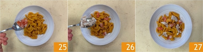 Sofort servieren, indem Sie die Teller mit den Garnelen 25 und den Krebsscheren 26 vervollständigen. Die gemischte Pasta mit Krebsscheren und Garnelenschwänzen ist bereit zum Genießen 27!