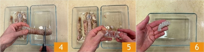 Trennen Sie den Kopf 4 und lösen Sie den Panzer vom Fleisch 5; legen Sie die geschälten Krebse beiseite 6 und bewahren Sie die Reste auf.