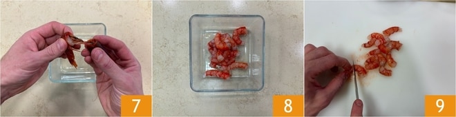 Schälen Sie auch die Garnelen: Trennen Sie den Kopf 7, entfernen Sie den Panzer und den Darm auf dem Rücken 8, dann halbieren Sie das Fleisch 9.
