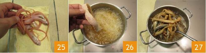 Dann mehlieren Sie auch die Gropen 25 und frittieren Sie sie zusammen mit den Sardellen 26. Warten Sie ein paar Minuten, und wenn sie gut gebräunt sind, nehmen Sie auch diese heraus 27 und legen Sie sie auf das Tablett mit dem Papier.