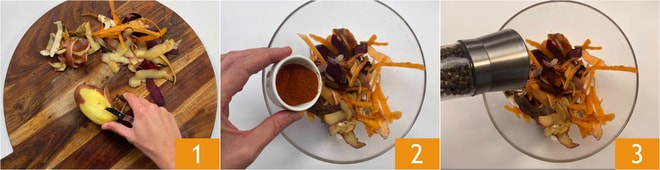 Um die Chips aus Gemüseschalen zuzubereiten, waschen Sie zunächst das Gemüse gründlich, trocknen Sie es ab und schälen Sie es dann mit einem Sparschäler 1. Trocknen Sie die Schalen erneut gut ab, geben Sie sie in eine Schüssel und würzen Sie sie mit Paprika 2 und Pfeffer 3.