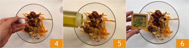 Salzen 4, mit Öl würzen 5 und mit Rosmarin abschmecken 6. Vermischen Sie alles gut, um die Aromen zu verteilen.