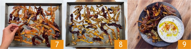 Legen Sie die Schalen auf ein Backblech 7 und backen Sie sie im vorgeheizten statischen Ofen bei 200°C für mindestens 15 Minuten oder bis sie knusprig sind 8. Die Zeiten können je nach Ofen variieren. Nehmen Sie sie heraus und lassen Sie die Chips aus Gemüseschalen abkühlen, bevor Sie sie servieren 9.