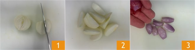Um die Gemüsebrühe in der Mikrowelle zuzubereiten, widmen Sie sich zunächst der Reinigung des Gemüses. Reinigen Sie eine goldene Zwiebel, teilen Sie sie in zwei Hälften 1 und schneiden Sie sie dann in Spalten 2. Reinigen Sie eine Schalotte und schneiden Sie sie in Spalten 3.