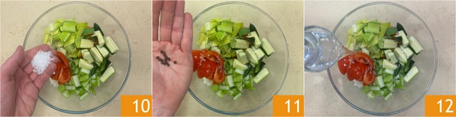 Legen Sie das gesamte Gemüse in eine Pyrex-Schüssel, fügen Sie das grobe Salz 10 und die Pfefferkörner 11 hinzu. Bedecken Sie es mit kaltem Wasser 12 und kochen Sie es in der Mikrowelle bei 650 W für 25 Minuten.