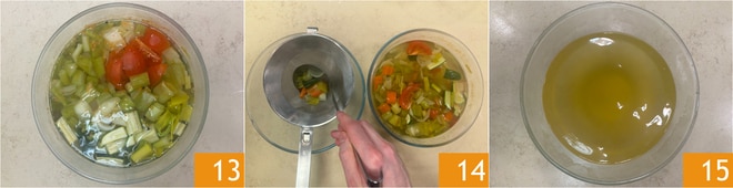 Nach dem Kochen 13 das Gemüse mit einem Sieb abseihen 14. Die Gemüsebrühe aus der Mikrowelle ist bereit 15 und kann für Ihre Rezepte verwendet werden.