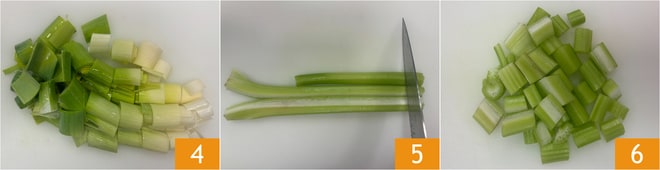 Entfernen Sie die Enden des Lauchs, teilen Sie ihn in zwei Hälften und schneiden Sie ihn in Stücke 4, schneiden Sie den Sellerie erst in zwei Hälften 5 und dann in Stücke 6.