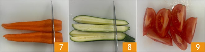 Waschen und schneiden Sie die Karotte 7 und die Zucchini 8 in Stücke. Waschen und schneiden Sie auch die Strauchtomaten in Spalten 9.