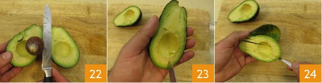 entfernen Sie den Kern 22, ritzen Sie mit einem kleinen Messer das innere Fruchtfleisch in regelmäßige Streifen ein 23, dann graben Sie den gesamten inneren Rand aus 24, um das Fruchtfleisch leichter herauszuholen (machen Sie dies nicht zu lange im Voraus, um zu vermeiden, dass das Fruchtfleisch oxidiert).