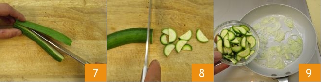 Schneiden Sie die Zucchini ab und halbieren Sie sie der Länge nach 7; schneiden Sie jede Hälfte in dünne Scheiben 8. Geben Sie die Zucchini in die Pfanne, sobald die Zwiebeln glasig sind 9,