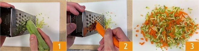 Um die Gemüse-Pfannkuchen zuzubereiten, beginnen Sie damit, die Zucchini gründlich zu waschen und die Enden zu entfernen, dann reiben Sie sie mit einer groben Reibe 1. Drücken Sie sie gut mit den Händen aus, um überschüssiges Wasser zu entfernen: Dieser Schritt ist entscheidend, um zu verhindern, dass der Teig zu flüssig wird. Verfahren Sie ebenso mit den Karotten: Schälen Sie sie mit einem Sparschäler, entfernen Sie die Enden und reiben Sie sie 2. Sammeln Sie Zucchini und Karotten 3 in einer Schüssel.