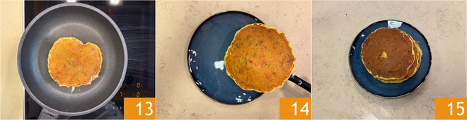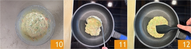 Vermengen Sie alles, um einen dichten und homogenen Teig zu erhalten 10. Erhitzen Sie eine antihaftbeschichtete Pfanne von etwa 15 cm Durchmesser bei mittlerer Hitze. Wenn sie gut heiß ist, geben Sie eine Kelle Teig in die Mitte 11 und drücken Sie die Oberfläche leicht mit einem Spatel ein, um eine runde und kompakte Form zu erhalten 12.