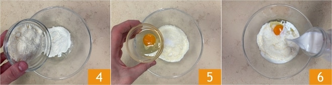 In einer anderen großen Schüssel geben Sie das Mehl Typ 00 und den geriebenen Parmesan 4, dann fügen Sie ein ganzes Ei 5, die Milch nach und nach 6 und das Salz hinzu.