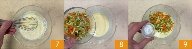 Vermengen Sie alles mit einem Schneebesen, bis Sie eine glatte und klumpenfreie Masse erhalten 7. Fügen Sie nun das gut ausgedrückte geriebene Gemüse 8 und das Instant-Backpulver für herzhafte Zubereitungen hinzu 9.