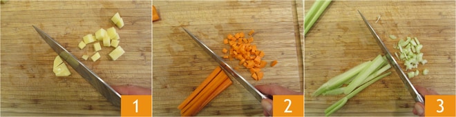 Um den herzhaften Gemüseauflauf zuzubereiten, schälen und würfeln Sie zuerst die Kartoffeln in Würfel von etwa 1 cm 1. Schneiden Sie die Karotten 2 und den Sellerie 3 in Würfel von etwa ½ cm.