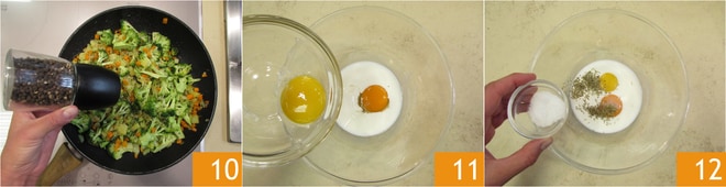 Mischen, salzen und pfeffern Sie 10. Lassen Sie alles bei starker Hitze etwa 5 Minuten garen. Schalten Sie die Hitze aus und stellen Sie es beiseite. In einer Schüssel geben Sie die Milch, das Ei, das Eigelb 11, die Kräuter und das Salz 12.