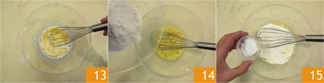 Rühren Sie mit einem Schneebesen 13. Integrieren Sie das Mehl 14 und das Backpulver 15.
