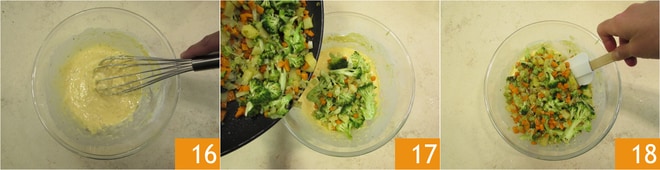 Gut mischen, bis Sie eine glatte Masse erhalten 16. Fügen Sie die inzwischen abgekühlten Gemüse zur Masse hinzu 17 und mischen Sie alles 18.