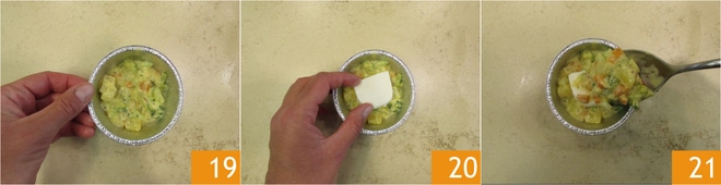 Fetten Sie 6 Aluformen ein. Füllen Sie die Formen bis zur Hälfte mit der Masse 19. Legen Sie in die Mitte jeder Form, auf die Gemüsemischung, ein Stück Mozzarella von etwa 4 cm 20. Decken Sie den Mozzarella mit der Gemüsemischung ab und füllen Sie die Form bis zum Rand 21.