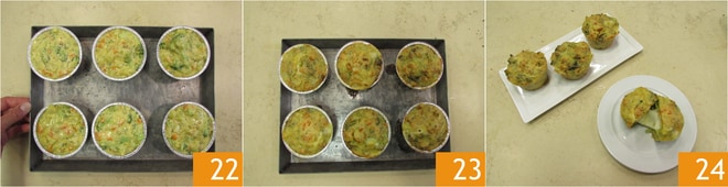 Stellen Sie die Formen auf ein Backblech 22 und backen Sie sie im vorgeheizten statischen Ofen bei 180° für 30/35 Minuten, bis die Oberfläche goldbraun ist. Aus dem Ofen nehmen 23 und den herzhaften Gemüseauflauf noch heiß stürzen 24.