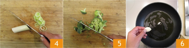 Schneiden Sie den Lauch dünn 4. Schneiden Sie den Brokkoli in Stücke 5. Geben Sie einen Schuss Öl in eine große Pfanne. Fügen Sie die Knoblauchzehe hinzu und braten Sie sie bei starker Hitze etwa 2 Minuten an.