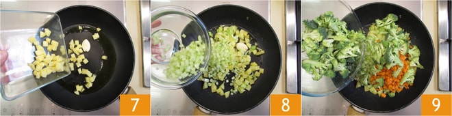 Fügen Sie dann die gewürfelten Kartoffeln 7 und den geschnittenen Lauch hinzu. Lassen Sie alles bei niedriger Hitze etwa 5 Minuten garen. Geben Sie das gesamte geschnittene Gemüse in die Pfanne 8 9.