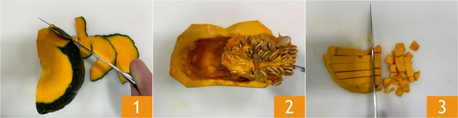 Um den Gemüseeintopf in der Mikrowelle zuzubereiten, waschen und trocknen Sie zuerst das Gemüse. Entfernen Sie die Schale des Kürbisses 1. Schaben Sie mit einem Löffel die Samen und inneren Fasern heraus 2. Schneiden Sie ihn dann zuerst in gleich dicke Scheiben und dann in Würfel von etwa 1 cm Kantenlänge 3.