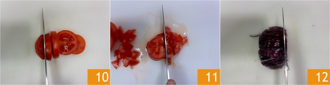 Schneiden Sie auch die Tomaten zuerst in Scheiben 10 und dann in Würfel 11. Hacken Sie die Zwiebel fein 12.