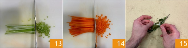 Schneiden Sie den Sellerie in Würfel 13, schälen Sie die Karotten und schneiden Sie sie zuerst in Streifen und dann in Würfel 14. Binden Sie mit einem Küchengarn den Zweig Rosmarin und die Lorbeerblätter zu einem Aromabündel zusammen 15.