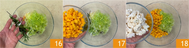 In einer großen, hitzebeständigen Schüssel geben Sie die Zwiebeln, Karotten und Sellerie, fügen Sie die Lauch und das Aromabündel hinzu 16. Fügen Sie den Kürbis 17 und den Blumenkohl hinzu 18.