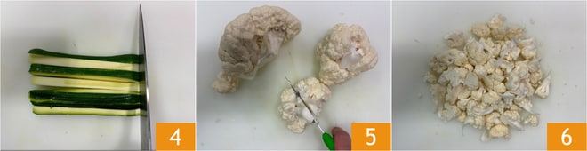 Schneiden Sie die Zucchini an den Enden ab, schneiden Sie sie zuerst in Scheiben und dann in Würfel von gleicher Größe wie der Kürbis 4. Schneiden Sie den Blumenkohl in zwei Hälften 5, entfernen Sie den zentralen Strunk und trennen Sie die Röschen 6.