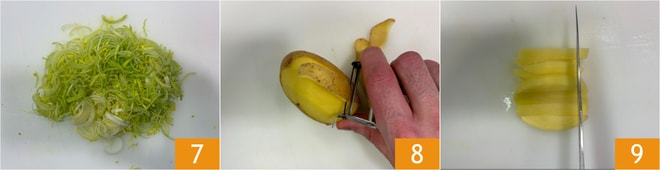 Entfernen Sie die äußeren Blätter des Lauchs und schneiden Sie ihn in dünne Ringe 7. Schälen Sie die Kartoffeln 8, schneiden Sie sie in dicke Scheiben und dann in Würfel 9.