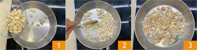 Um die gerösteten Mandeln in der Pfanne zuzubereiten, erhitzen Sie eine Pfanne (möglichst aus Stahl mit dickem Boden, aber Sie können auch eine antihaftbeschichtete Pfanne verwenden) bei mittlerer bis niedriger Hitze. Sobald sie heiß ist, geben Sie die Mandeln in die Pfanne 1 und rösten Sie sie bei niedriger Hitze etwa 10 Minuten lang, dabei häufig umrühren 2. Wenn sie sehr heiß und schön goldbraun sind, sind Ihre gerösteten Mandeln fertig 3!