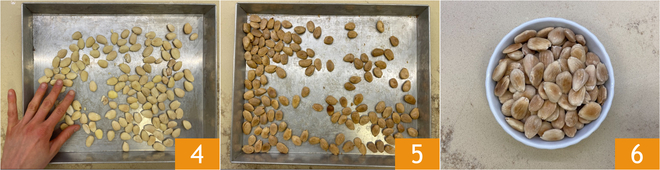 Um die gerösteten Mandeln im Ofen zuzubereiten, verteilen Sie die Mandeln in einer Form, indem Sie sie voneinander trennen 4. Backen Sie sie im vorgeheizten statischen Ofen bei 180°C für etwa 15 Minuten oder bis sie goldbraun sind 5 und überwachen Sie den Backvorgang, um ein Verbrennen zu vermeiden. Sobald sie goldbraun sind, aus dem Ofen nehmen und abkühlen lassen. Ihre gerösteten Mandeln sind bereit, genossen zu werden 6!