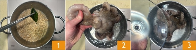 Um den gerösteten Oktopus mit Bohnenhummus und Tzatziki-Sauce zuzubereiten, weichen Sie zuerst die getrockneten Cannellini-Bohnen über Nacht ein. Nach dem Einweichen abgießen und in einen Topf geben, mit kaltem Wasser bedecken und anderthalb Stunden kochen lassen, mit einem Lorbeerblatt 1. In der Zwischenzeit bringen Sie einen weiteren Topf mit Wasser zum Kochen und tauchen Sie den Oktopus dreimal, indem Sie ihn am Kopf halten, um die Tentakel zu kräuseln 2. Dann den Oktopus komplett in das kochende Wasser tauchen und zugedeckt 40 Minuten kochen 3.