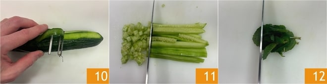 Fahren Sie mit der Tzatziki-Sauce fort: Schälen Sie die Gurken 10 und schneiden Sie sie in kleine Würfel 11, dann hacken Sie die Minze fein 12.