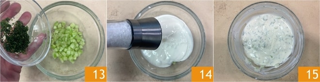 Geben Sie die Gurken und die Minze in eine Schüssel 13, dann das griechische Joghurt leicht salzen 14 und in die Schüssel mischen 15.