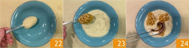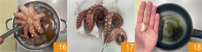 Zu diesem Zeitpunkt ist der Oktopus gekocht, also abgießen 16 und auf ein Schneidebrett legen, dann die Tentakel mit einem Messer trennen 17. In einer Pfanne das Öl mit einer Knoblauchzehe anbraten 18.