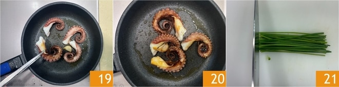 Legen Sie die Oktopustentakel hinein und braten Sie sie einige Minuten auf beiden Seiten an 19, bis sie goldbraun und knusprig sind 20. Zum Schluss schneiden Sie den Schnittlauch fein 21.
