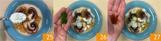 Sie sind bereit zu servieren: Verteilen Sie das Bohnenhummus auf dem Boden des Tellers 22, dann fügen Sie die Bohnen mit Paprika 23 und die Oktopustentakel hinzu 24.