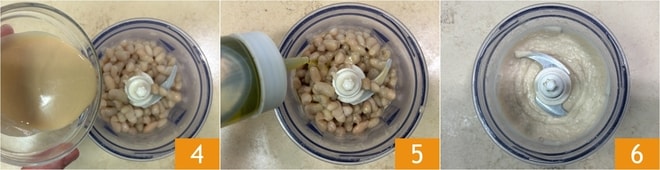 Nach der Garzeit der Bohnen diese abgießen und drei Viertel davon in einen Mixer geben, dann die Tahini 4, den Zitronensaft, das Öl 5 und das Salz hinzufügen. Mixen, um eine glatte und homogene Creme zu erhalten 6.