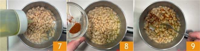 Das Hummus beiseite stellen und die restlichen Bohnen in einen kleinen Topf geben, dann mit Öl 7, Salz und Paprika 8 würzen. Den Herd einschalten und einige Minuten rühren 9, dann beiseite stellen.