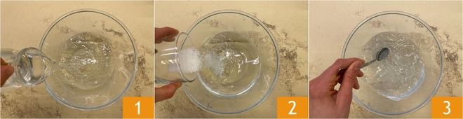 Um die gesalzenen Mandeln zuzubereiten, geben Sie zuerst das lauwarme Wasser in eine Schüssel 1, fügen Sie das grobe Salz hinzu 2 und rühren Sie, um es aufzulösen 3.