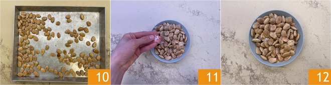 Nach der Einweichzeit lassen Sie die Mandeln abtropfen 7 und verteilen sie auf einem Backblech 8. Backen Sie sie im statischen Ofen bei 180° für 15-20 Minuten 9