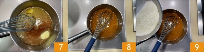Sobald der Zucker vollständig geschmolzen ist und Ihr Karamell eine bernsteinfarbene Farbe erreicht hat 4, reduzieren Sie die Hitze. Fügen Sie sofort die Butter 5 und das Salz 6 hinzu.