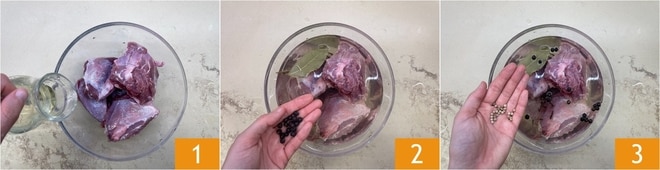 Um die geschmorte Schweinebacke mit kleinen Zwiebeln zuzubereiten, legen Sie zunächst das Fleisch zum Marinieren ein. Legen Sie die Backen in eine Schüssel und bedecken Sie sie mit Weißwein 1. Fügen Sie dann die Gewürze hinzu: Lorbeer, Wacholderbeeren 2, Nelken und weißen Pfeffer 3.