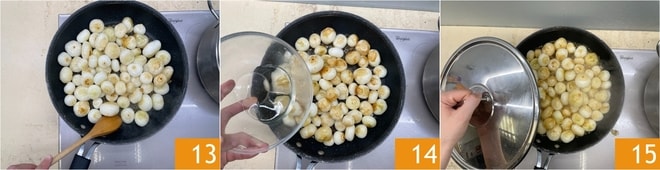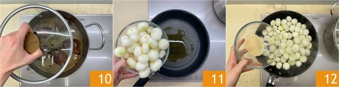 Bedecken Sie den Topf mit einem Deckel 10, reduzieren Sie die Hitze auf ein Minimum und lassen Sie sie etwa 3 Stunden kochen. In der Zwischenzeit setzen Sie die Kartoffeln in kaltem Wasser auf und kochen sie 30-40 Minuten lang, bis sie weich sind, wenn Sie sie mit den Zinken einer Gabel anstechen. Bereiten Sie nun auch die süß-sauren kleinen Zwiebeln vor. Geben Sie einen Schuss Öl in eine beschichtete Pfanne und lassen Sie es erhitzen. Geben Sie die kleinen Zwiebeln hinzu 11 und lassen Sie sie ein paar Minuten anbraten, dann fügen Sie den braunen Zucker hinzu 12.
