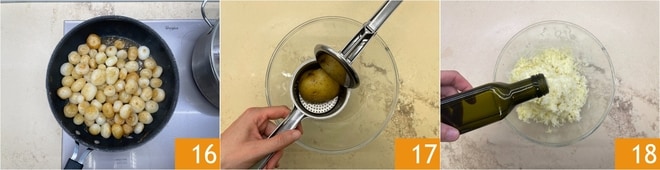 Wenn sie fertig sind, also schön gefärbt und weich 16, schalten Sie die Hitze aus und legen Sie sie beiseite. Sobald die Kartoffeln gekocht sind, zerdrücken Sie sie mit dem entsprechenden Gerät in einer Schüssel 17. Fügen Sie das Olivenöl 18 und das Salz hinzu.