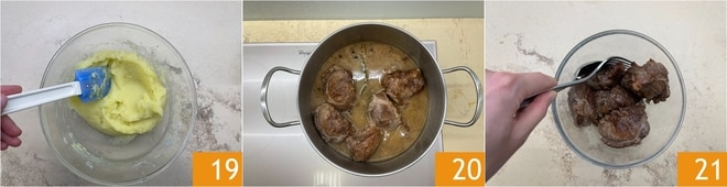Rühren Sie kräftig, bis Sie eine glatte und homogene Konsistenz erhalten 19. Dann legen Sie es beiseite. Nach den 3 Stunden werden die Backen zart sein 20, transferieren Sie sie in eine Schüssel 21, während Sie den Bratensaft im Topf lassen.