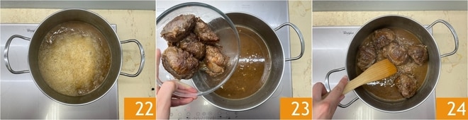 Erhöhen Sie die Hitze auf das Maximum und lassen Sie es kochen 22, bis die Sauce reduziert ist und Sie eine dichte Sauce erhalten. Geben Sie die Backen wieder hinein 23 und rühren Sie um 24, um sie gut mit der Sauce zu überziehen.